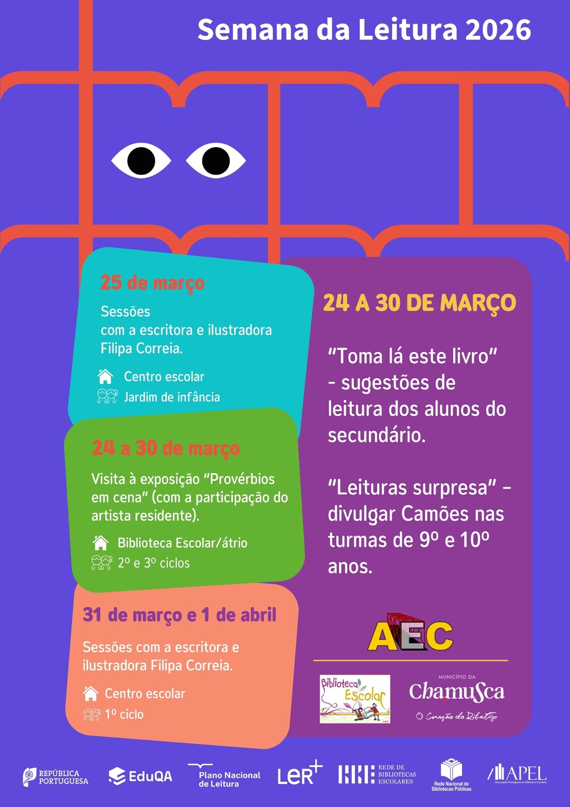 A Semana da Leitura 2026 decorre de 24 de março a 1 de abril e envolve a comunidade escolar do concelho em diversas atividades dedicadas ao livro e à leitura. O programa inclui sessões com a escritora e ilustradora Filipa Correia, visitas à exposição “Provérbios em cena” e iniciativas dinamizadas pelos alunos.